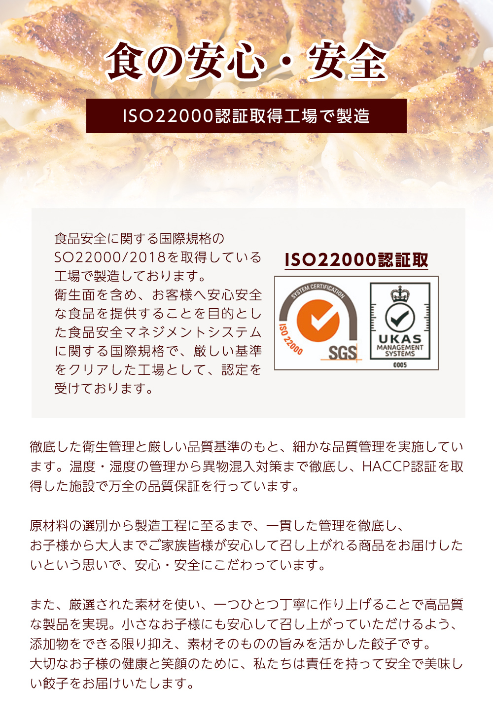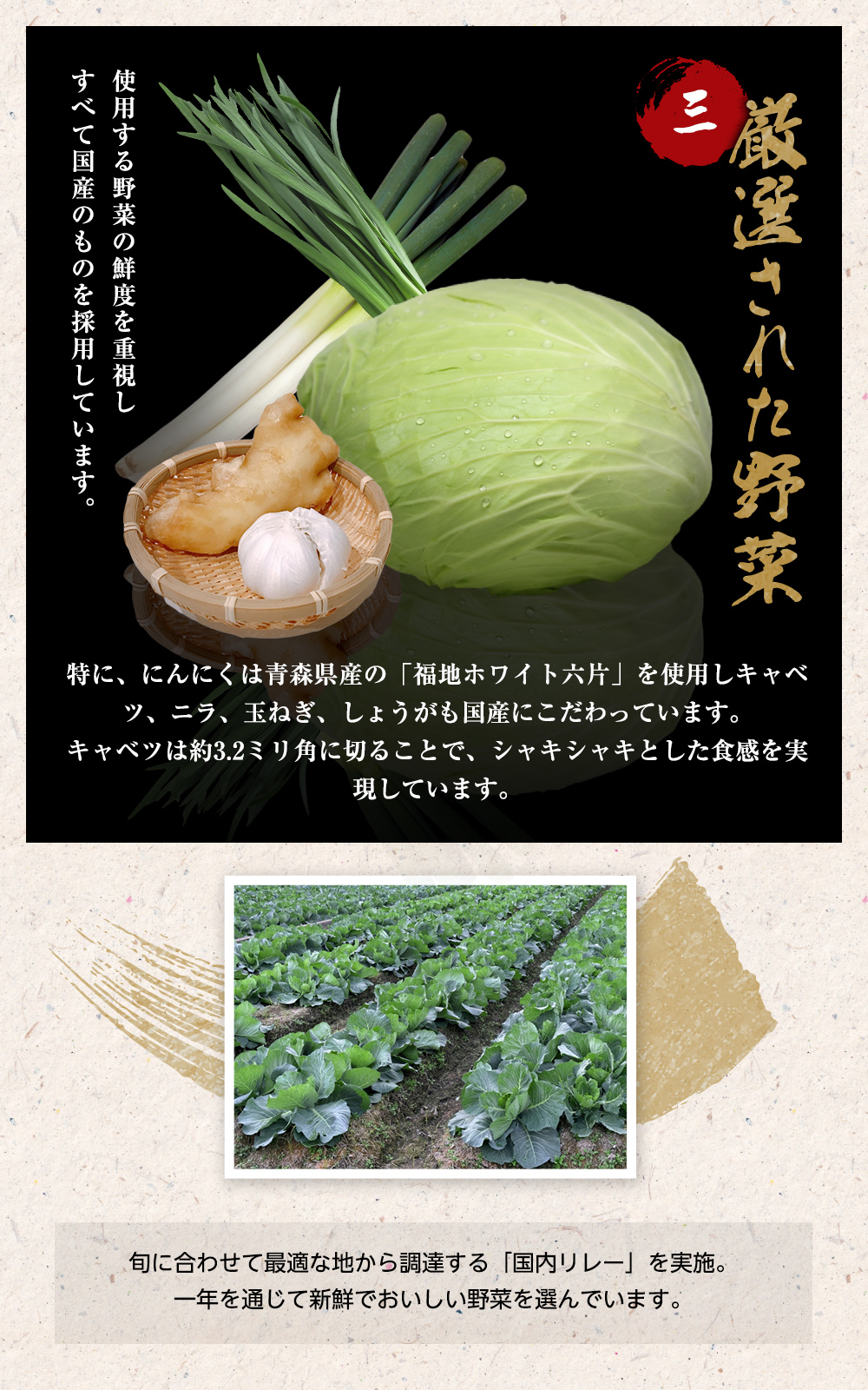 原材料:野菜(キャベツ(国産)、たまねぎ、にら、にんにく、しょうが)、豚肉(国産)、豚脂、粒状大豆たん白、焼豚用しょうゆ、でん粉、食塩、ごま油、砂糖、たん白自己消化物、酵母エキス、こしょう、皮(小麦粉、食塩)/カラメル色素、甘味料(甘草)、(一部に豚肉・大豆・小麦・ごまを含む)