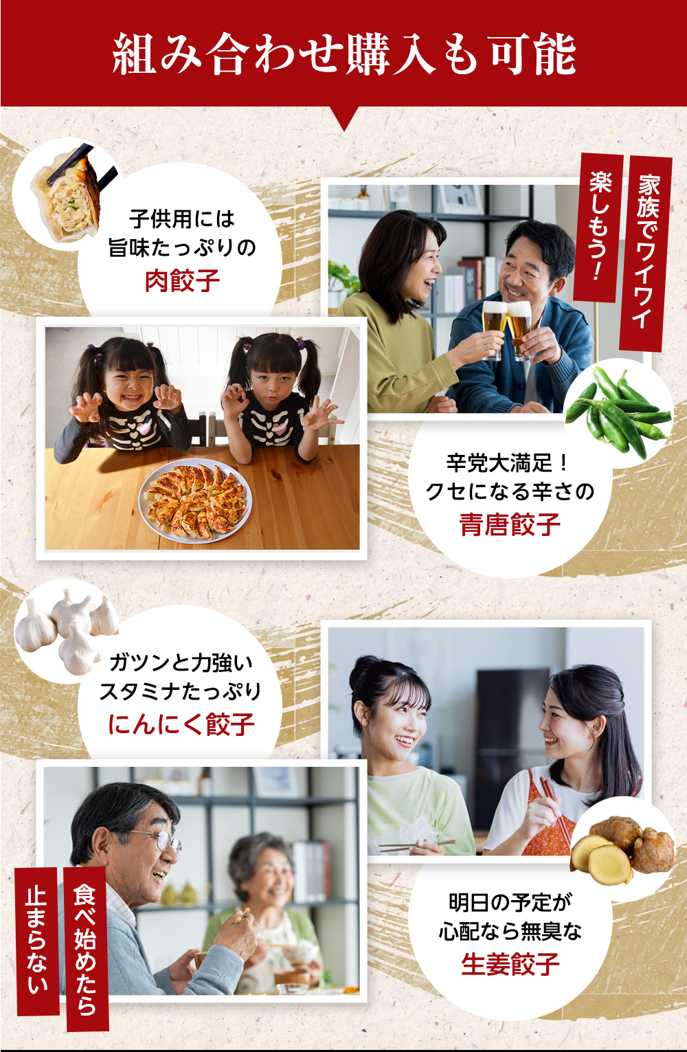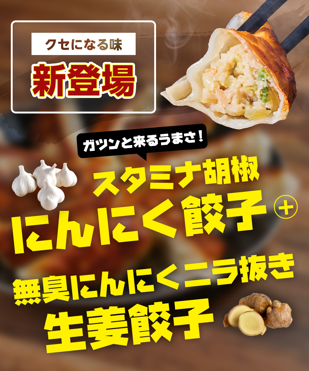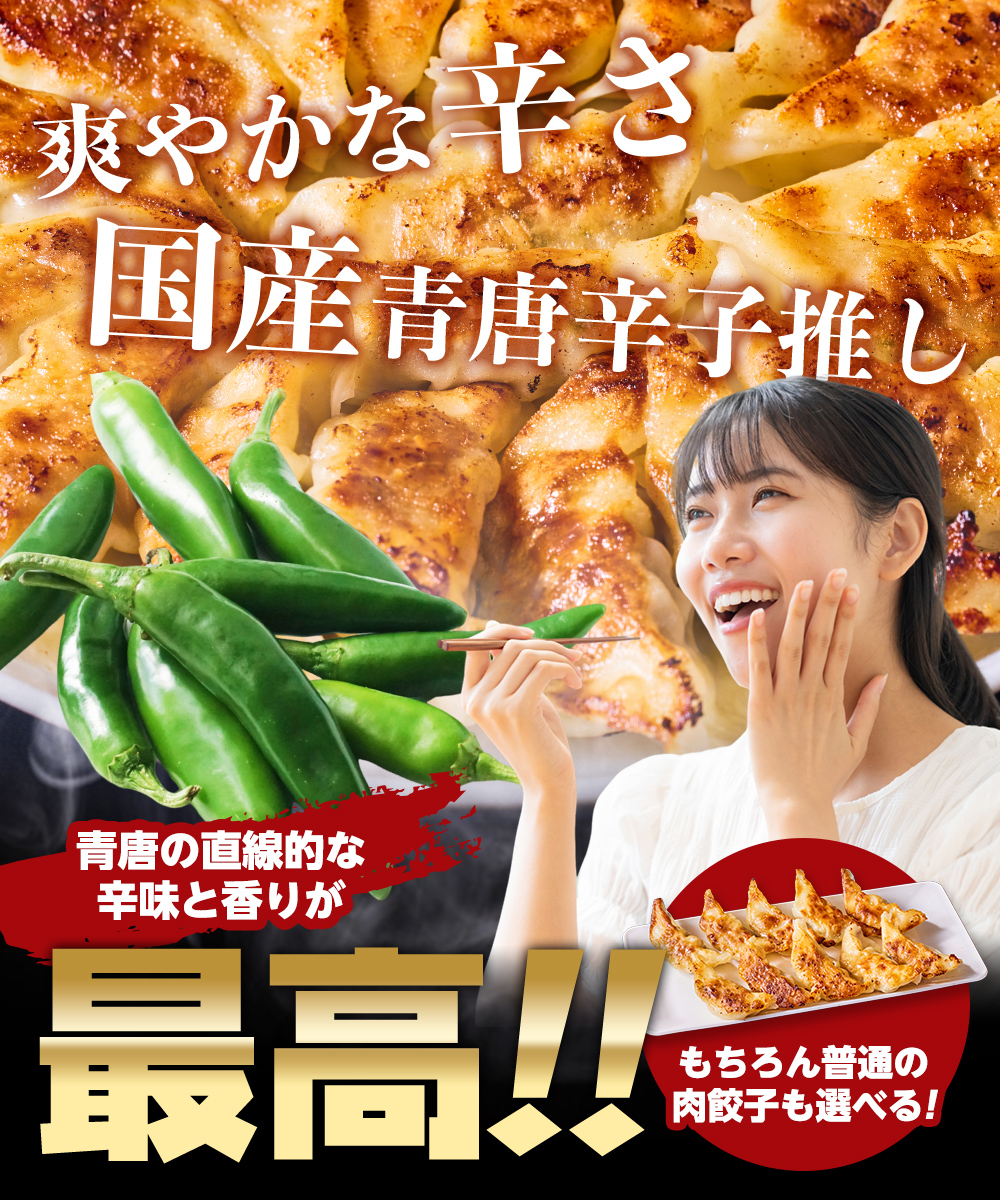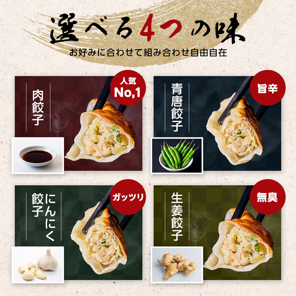 ★味は4種!定番の「肉餃子」、しっかり辛い「青唐餃子」、スタミナ重視「にんにく餃子」、さっぱりの「生姜餃子」